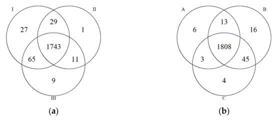 After the quality check, sequencing and chimera removal the diversities of the rhizosphere soil bacterial and fungal communities of black locust and poplar plantations using the 16S rRNA and ITS rRNA primer sets across per sample were obtained and cluster analysis to read operational taxonomic units (OTU) at 100% identity by BLAST (Figure 2, Tables S3 and S4). Venn diagrams were employed to compare the rhizosphere soil bacterial and fungal communities based on unique and shared OTUs among the different treatments. Bacterial communities in both plantations contained more OTUs than fungal communities. However, the fungal communities, compared to the bacterial communities, contained higher proportions of unique OTUs in the same treatments in rhizosphere soil of black locust (10.2%, 7.2% and 5.4%) and poplar (10%, 10.6% and 10.6%) plantations.