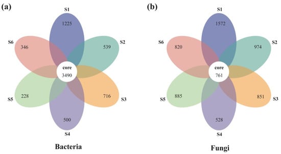Flower diagram of the common and unique bacterial (a) and fungal (b) OTUs across a subalpine forest succession series. S1 to S6 represent successional stages from 1 to 6, respectively.