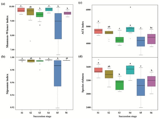 Differences in bacterial alpha diversity across a subalpine forest succession series. Calculations based on the OTUs at 97% sequence identity. Shannon-Wiener index (a), Simpson index (b), ACE index (c) and Species richness (d) represent the indices of alpha diversity. Values followed by different lowercase letters mean significant difference (p < 0.05) among six successional series based on Wilcoxon rank-sum test. S1 to S6 represent successional stages from 1 to 6, respectively.