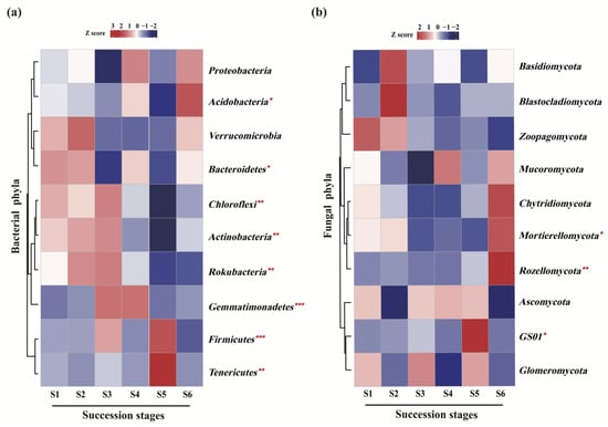 Relative abundance and significance analyses of the dominant soil bacterial (a) and fungal (b) communities at phylum level across a subalpine forest succession series. Significant effect: * p < 0.05, ** p < 0.01, *** p < 0.001. Kruskal-Wallis test. S1 to S6 represent successional stages from 1 to 6, respectively.