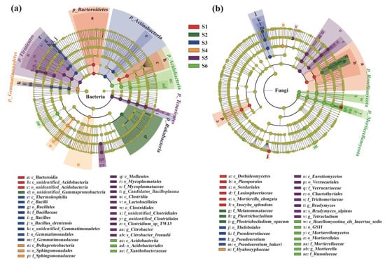 Cladograms generated by linear discriminant analysis effect size (LEfSe) indicating differences in the bacterial (a) and fungal (b) taxa across a subalpine forest succession series. Different colored bars indicate taxa were enrichment in the corresponding succession stages. S1 to S6 represent successional stages from 1 to 6, respectively.