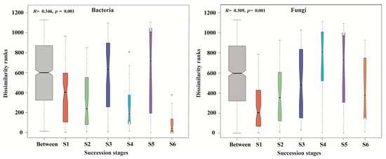 Boxplot of analysis of similarities (ANOSIM) based on the Bray–Curtis distances of samples for the dissimilarities of bacterial and fungal communities across a subalpine forest succession series. S1 to S6 represent successional stages from 1 to 6, respectively.