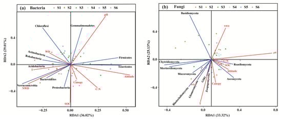 According to the analysis of detrended correspondence analysis (DCA) (Table S4), RDA was selected to analyze the relationships of soil microbial diversity with second forest variables based on the analysis of variance inflation factor (VIF) (Table S5). RDA confirmed that the variations in soil bacterial and fungal communities across the successional series were associated with forest variables (Figure 7). Among the forest variables, soil pH had an extremely significant effect on soil bacterial (p < 0.01) and fungal community composition (p < 0.001; Table 4 and Table 5). Meanwhile, soil bacterial diversity was also significantly affected by SOC, soil T, the stock of non-woody debris (NWD) and altitude (p < 0.05; Table 4), while soil fungal community composition was also significantly influenced by soil temperature (T) (p < 0.05; Table 5). In particular, among dominant bacterial phyla, soil pH was significantly and positively correlated with the relative abundance of Gemmatimonadetes and Firmicutes, but markedly and negatively correlated with the abundance of Proteobacteria, Bacteroidetes and Verrucomicrobia (Figure 7a). The stock of NWD and soil temperature (T) was prominently and positively correlated with the abundance of most of the bacterial phyla, but observably and negatively correlated with the abundance of Gemmatimonadetes, Firmicutes and Tenericutes. On the contrary, the correlation of altitude and most of soil bacterial community composition was negative (Figure 7a). In addition, the relative abundance of Proteobacteria and Bacteroidetes were also significantly and positively correlated with the concentration of SOC (Figure 7a). Among dominant fungal phyla, soil pH was notably positively correlated with the abundance of Rozellomycota and Ascomycota not the other dominant phyla (Figure 7b). In contrast, soil temperature (T) was significantly and positively correlated with the abundance of the most abundant phyla, except for Rozellomycota and Basidiomycota (Figure 7b).