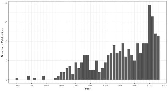 The need for a more thorough description and considerations about study sites, tree species, elements, and experimental design continues from the now common debate and questioning of the reliability of dendrochemical research results. Because trees are not passive to the fluctuations and changes in the environments they grow in, and because of the many variables present from in situ experiments, multiple dendrochemistry studies will often find conflicting results [,,,,,,,,]. While the confusion surrounding the appropriate methodologies for dendrochemistry has yet to reach a clear consensus, the number of publications has increased in recent years (Figure 1). Dendrochemistry has been applied to a variety of specific applications, including the quantification and timeline of heavy metals being released into the environment [,,,,], acidification, nutrient retention and stability of forests [,,,,,], stable isotope research [,,,,,,], and hydrocarbon contamination [,,,,,].