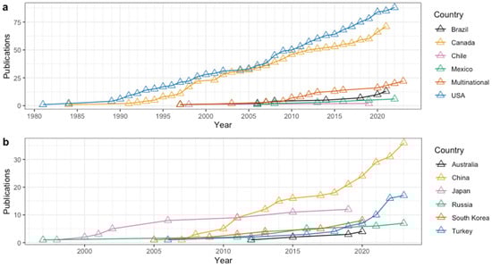 From the 426 papers analyzed, 42 countries worldwide are considered primary countries that have published dendrochemistry studies (Figure 2, Figure 3 and Figure 4). Primary publication countries were determined by where most co-authors were affiliated and where the research occurred. Most papers had co-author lists from the same country and often the same institutional affiliation [,,]. However, if a paper had a roughly equal number of co-authors from two different counties, each country was considered a primary representative of that paper [,,]. Recently, there have been several publications with co-authors affiliated with institutions from around the world; these studies were considered multinational (Figure 2a) [,,].