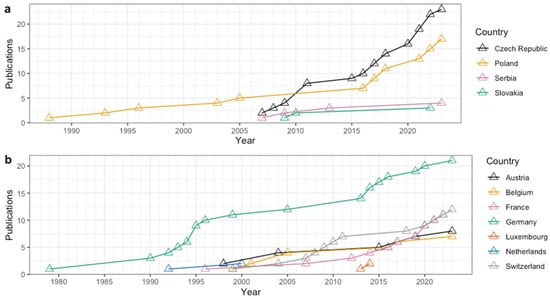 (a) Eastern European countries’ total dendrochemistry publications, (b) Western European countries’ total dendrochemistry publications over time.