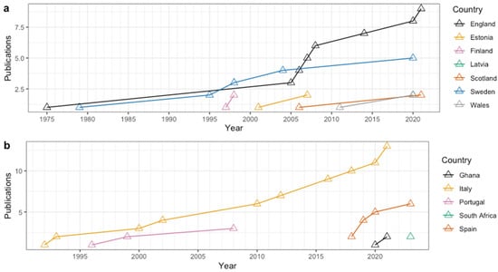 (a) Northern European countries’ total dendrochemistry publications, (note, that as of 2020, Latvia and Wales both have two dendrochemistry publications) (b) Southern European and African countries’ total dendrochemistry publications over time.