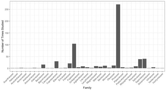 From the articles reviewed, there are 166 tree species, from 86 genera, across 35 families that have been used in dendrochemistry studies. Because many studies included multiple species of trees in their experiments, the total number of trees is greater than the number of articles reviewed. The majority of the trees that have been studied are within the Pinaceae family (271), followed by the Fagaceae family (104), and finally, the Sapindaceae family (40) (Figure 5). The diversity of tree species reflects the diversity of the researchers in dendrochemistry. Some articles did not report the species of trees used, and others grouped trees of the same genus that are similar ecologically to increase the number of samples in the study [,,,,,,].