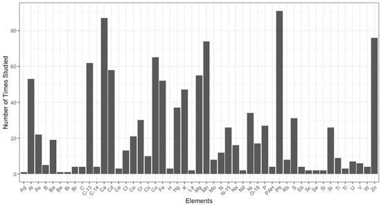 The studies reviewed looked at a wide range of elements and isotopes. Some of the studies focused on one specific element, like mercury (Hg) or lead (Pb) [,,,,,,,]. Other studies focused on specific isotopes and tracer elements [,,,,,,,]. Many studies focused on a handful of elements to identify environmental changes, either through acidification or the addition of heavy metals [,,,,,,,,]. However, most studies looked at the general elemental profile of tree samples to identify elements of interest or of higher concentration than expected [,,]. The most studied element in dendrochemistry from this review is lead (Pb), with 91 articles including it within the scope of the research (Figure 6). The second most studied is calcium (Ca), with 87 studies, followed by Zinc (Zn), with 76 studies and Manganese (Mn) at 74. The lighter elements on the periodic table, such as Ca, aluminum (Al), potassium (K), and magnesium (Mg), were among the most common elements studied, as well as the first full row of transition metals on the periodic table including copper (Cu), nickel (Ni), Zn, and iron (Fe) (Figure 6). The most common isotopes studies in dendrochemistry have been carbon (C)13 and nitrogen (N)15 (Figure 6). Many studies focused simply on the general elements present and did not focus their research until after determining elements of interest. From this review, a total of 55 different elements and isotopes have been studied in dendrochemistry.