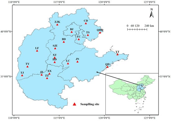 This study encompassed five provinces in northern China (Figure 1). These provinces are the primary regions for P. propinqua cultivation, extensively employed in urban and rural greening initiatives []. The study area extended from approximately 110.92 to 121.46° E longitude and 34.81 to 40.91° N latitude, with altitudes ranging from 3 to 788 m. The prevailing climate is characterized by a temperate monsoon climate, featuring a mean annual precipitation (MAP) ranging from 418.82 to 666.5 mm and a mean annual temperature (MAT) varying from 9.00 to 15.40 °C. (Table 1). Soil types in the area are primarily Fluvisols in the WRB system, with sparse understory vegetation.