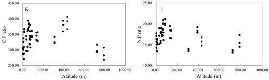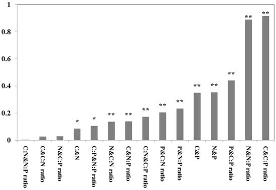 Leaf C, N, and P concentrations and the N:P ratio were significantly correlated with each other (p < 0.05). Moreover, leaf C concentrations exhibited a significant correlation with C:P ratios (p < 0.01). Leaf N concentrations were significantly correlated with P concentrations, C:N and N:P ratios (p < 0.01), and leaf P concentrations were significantly correlated with C:P ratios (p < 0.01). Moreover, leaf C:N, C:P and N:P ratios were significantly correlated with each other (Figure 2, p < 0.05).
