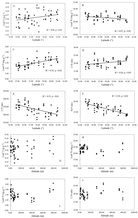 With increasing latitude, leaf C and P concentrations, as well as C:N ratios, exhibited significant increases (p < 0.05), while leaf N concentrations and N:P ratios decreased significantly (Figure 3, p < 0.05). Conversely, leaf C, N, and P concentrations did not exhibit significant associations with altitude (Figure 3, p > 0.05).