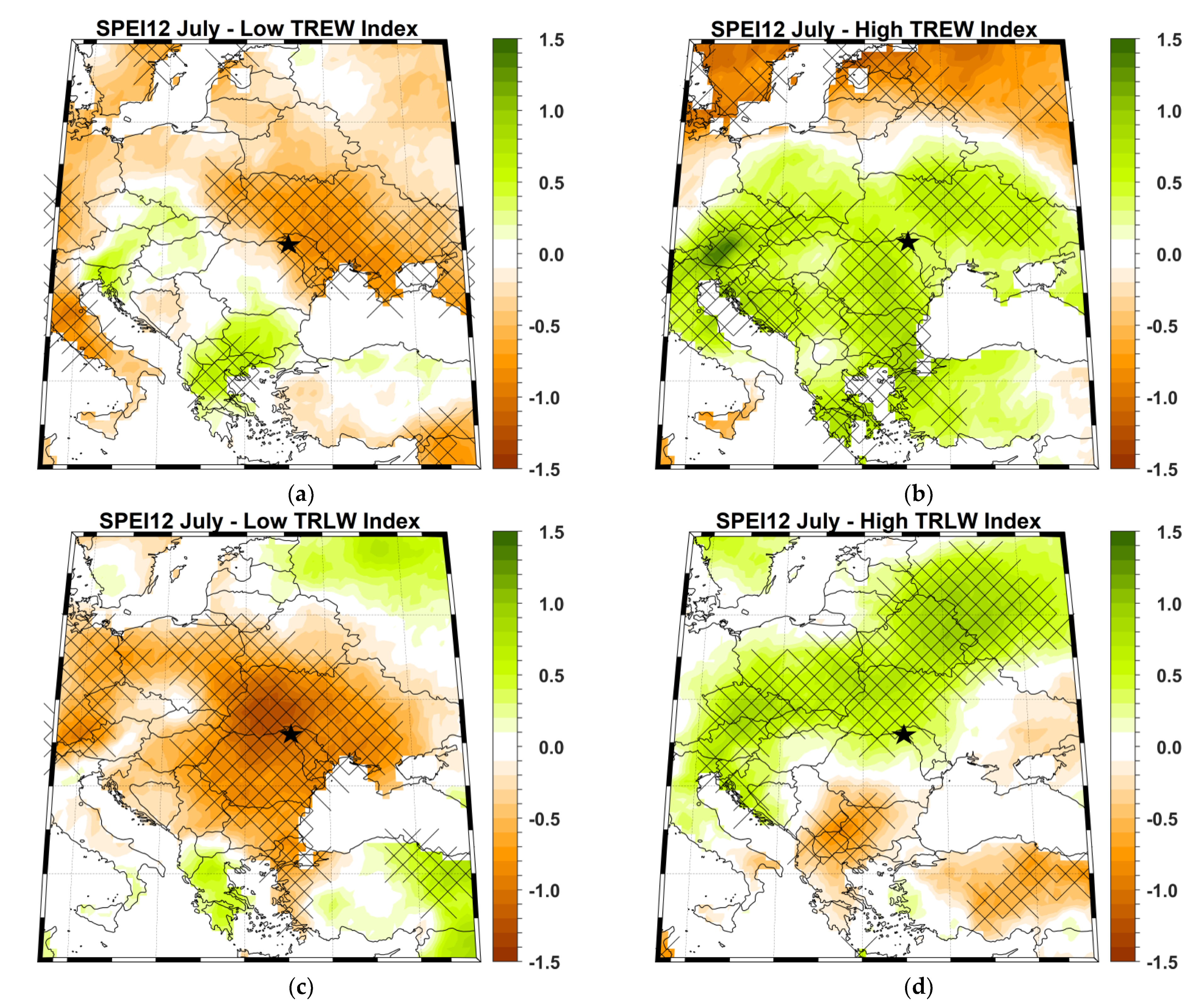 Because the highest correlations for early (late) wood were obtained for SPEI12, we looked at the composite maps for those years with extreme values for TREW and TRLW (Table 4) with respect to the spatial variability of July SPEI12 (Figure 6). As can be inferred from Figure 6, the response of negative TREW years is very regional, and is usually associated with drought conditions over the analyzed region as well as in the northeastern part of Romania (i.e., Ukraine and a small part of Poland; see Figure 6a). Positive TREW years are associated with wet conditions extending over the central and eastern parts of Europe (Figure 6b). Conversely, negative TRLW values are associated with drought conditions extending over large parts of Europe, with the strongest signal over Romania (Figure 6c). Positive TRLW years are associated with wet conditions restricted mainly to the analyzed region and a few areas in Ukraine, Poland, and western Russia (Figure 6d). Based on the obtained results presented in Figure 6, we can conclude that TREW seems more sensitive to wet years, while TRLW is more sensitive to drought, both locally and over an extended spatial scale.