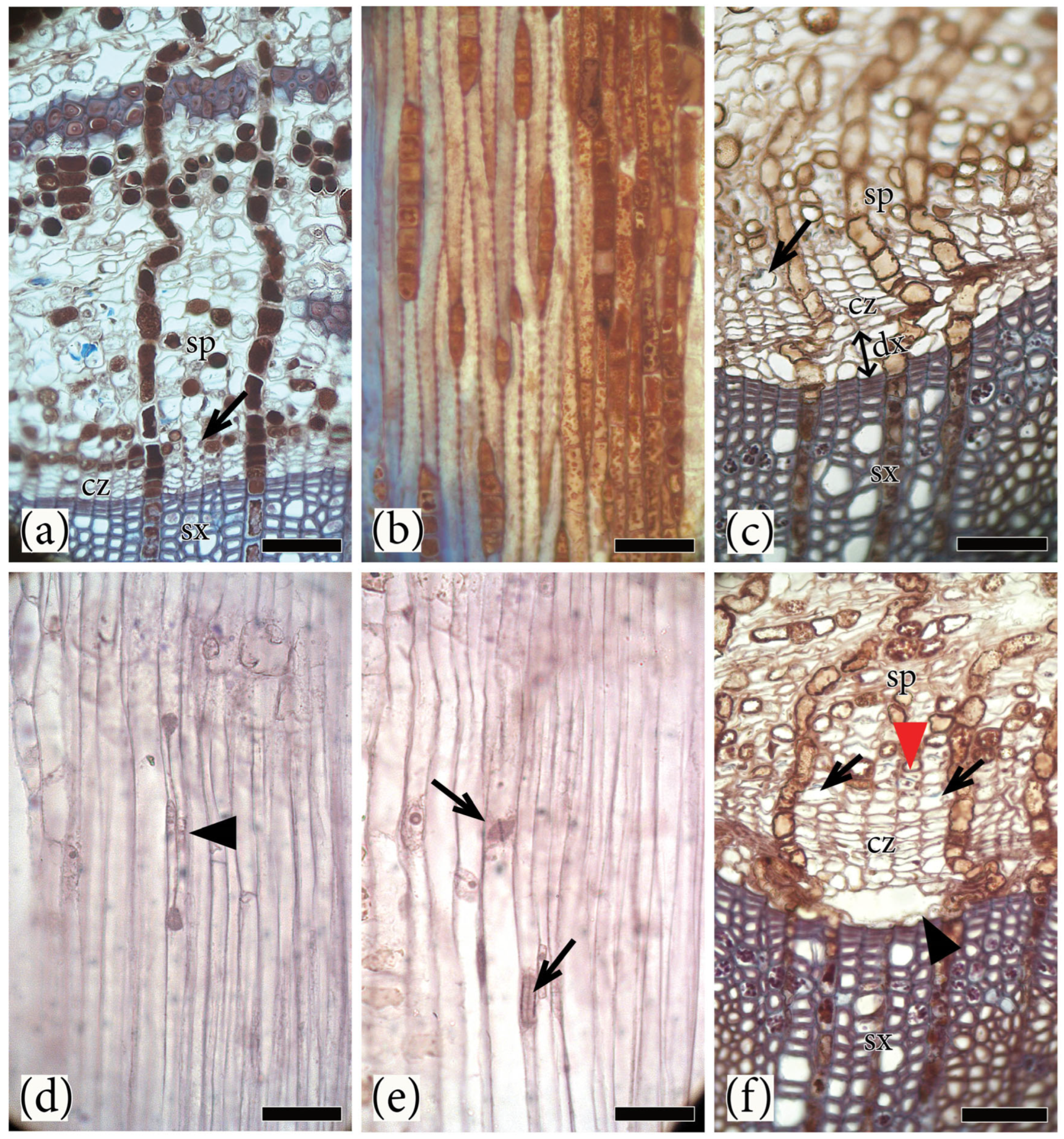 - Artschwager, E. The time factor in the differentiation of secondary xylem and phloem in pecan. Am. J. Bot. 1950, 37, 15–24. [Google Scholar] [CrossRef]