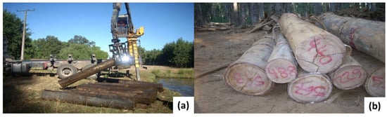 In 2019, there were 580,726 hectares of Eucalyptus globulus and 273,867 hectares of Eucalyptus nitens planted in Chile []. Eucalyptus is the third commercially important forest species in Chile [] and has the highest growth rate recorded not only in Chile but in the world (up to 77 m3/ha/year) []. Furthermore, the Eucalyptus genus has a basic density ranging from 490 kg⸱m−3 to 520 kg⸱m−3 and has a high tolerance to low temperatures [,,]. These characteristics make Eucalyptus an excellent raw material for the pulp and paper industry []. However, the mechanical processing industries has had difficulties in producing products with higher added value due to some limitations and unfavorable features such as relatively high shrinkage, susceptibility to collapse during drying, and mainly the presence of growth stresses, which produce defects in logs such as end-splitting, cracks, and warping during and after sawing [,]. These drawbacks affect the lumber quality. Therefore, the use of Eucalyptus for the production of wood products presents a major technological challenge.