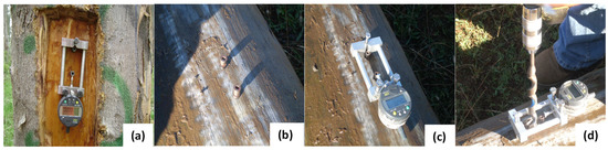 Measurement of the peripheral longitudinal strains in logs immersed in water. (a): rectangular window; (b): nails (distance: 45 mm); (c): Extensometer (d): Extensometer and a 20 mm-diameter drill bit.