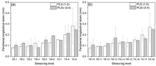 Average values of PLS. (a): Untreated logs and (b): logs immersed in water. Where: PLS (1–2): Peripheral longitudinal strain, standing trees. PLSv (3–4): Peripheral longitudinal strain, after felling. PLSi (3–4): Peripheral longitudinal strain after water immersion. TB: Low stress. TM: Medium stress. TA: High stress.