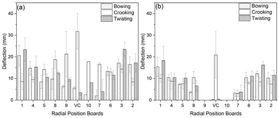 Figure 4a,b shows the behavior of the average deflection values for the different warpings in wood immersed in water and without treatment, following the bark-to-bark direction. In addition, a decline in the bark–pith direction is observed for both defects bowing and twisting, while for crooking, there was an increase in the bark–pith direction.