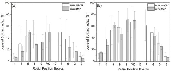 End splitting index variation along the sawn lumber in the radial direction. (a): before and (b): after air-drying. w/o water: Without water; w/water: with water.