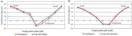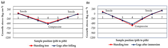 Figure 6a,b shows the growth stresses in the radial direction of the specimens of the central beam immersed in water and control, which were determined by []. It is shown that there were both tensile and compressive stresses at the ends of the trees, increasing from the bark to the pith. In addition, the three stress levels were reduced in the logs with water treatment. For the control logs, there were a decrease of 38 kg⸱cm−2 in the low-stress level, 82 kg⸱cm−2 in the medium-stress level, and 72 kg cm−2 in the high-stress level.