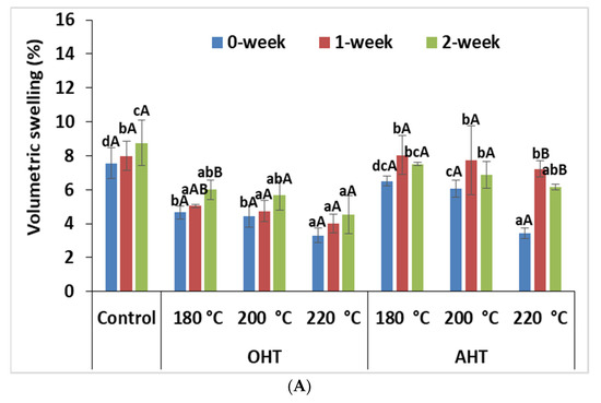 Volumetric swelling in water-immersed P. tomentosa (A) and P. koraiensis (B) woods exposed to artificial weathering. The same capital and lowercase letters on the histogram represent the insignificant outcomes at the 5% significance level between weathering duration and between treatment conditions (AHT, OHT, and control), respectively.