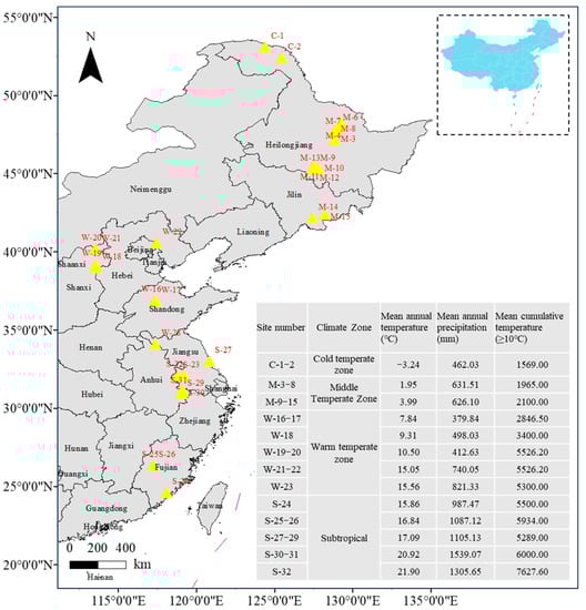 This study was conducted in northeastern, northern, and eastern China, and the study areas spanned four climatic zones: cold temperate, mesothermal, warm temperate, and subtropical. Sites C-1–2 are located in the cold temperate zone and possess a cold continental monsoon climate: short and cold summers, long and severe winters, large annual temperature differences, scarce precipitation and mainly snowfall, and weak solar radiation. Sites M-3–15 are located in the middle temperate zone, which possesses a middle temperate continental monsoon climate: hot and humid in summer, cold and dry in winter, large annual temperature difference, concentrated precipitation, four distinct seasons, and low annual rainfall. Sites W-16–23 are located in the warm temperate zone, which possesses a warm temperate monsoon climate: hot and rainy in summer, cold and dry in winter; rain and heat at the same time, and precipitation is mainly concentrated in the summer (about 80% of the annual precipitation), while the other seasons receive less precipitation. Sites S-24–32 are located in the subtropics, which possesses a subtropical monsoon climate: hot and dry in summer, mild and rainy in winter, rain and heat at different times, abundant precipitation in winter, and a hot and dry climate in summer with little rain and plenty of sunshine. The detailed hydrothermal conditions of the sampling sites are shown in Figure 1, data from China Meteorological Data Service Center (CMDC); the vegetation conditions of each sampling site are shown in Table S1.