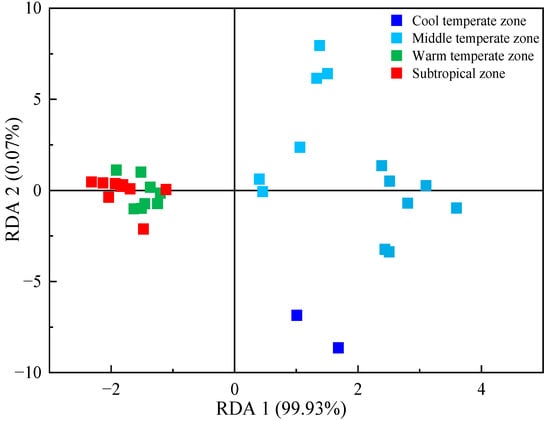 The influence of climatic factors on SOC and STN was analyzed via redundancy analysis. Variables with high loadings contribute highly to the respective components (RDAs)—these values are shown in bold.