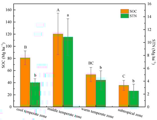 Storages of SOC and STN in forest soils of different climatic zones. Differing capital letters indicate significantly different SOC storages between different climatic zones, while differing lowercase letters represent significantly different STN storages between different climatic zones.