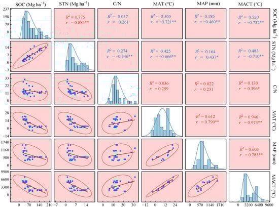 We performed Pearson correlation analysis and regression analysis of SOC storages and STN storages with climatic conditions (MAT, MAP, and MACT) for sample sites in different climatic zones. Pearson correlation coefficients were used to evaluate the relationships between the corresponding variables. The results showed a highly significant positive correlation between SOC storages and STN storages, while SOC storages and STN storages showed a highly significant negative correlation with climatic conditions (MAT, MAP, and MACT). In addition, the Pearson correlation coefficient showed that temperature had a greater effect on SOC storage and STN storage than rainfall.