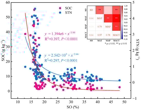 As shown in Figure 5, by correlating SO content with climatic conditions (MAT, MAP, and MACT), we found that SO content showed a significant (p < 0.01) positive correlation with MAT and MACT and a positive correlation with MAP. The regression analysis of SOC and STN content with SO content showed that SOC and STN contents had the same trend with the increase in SO content (R2 = 0.40, p < 0.0001; R2 = 0.30, p < 0.0001), but STN contents decreased at a lower rate with the increase in SO content.