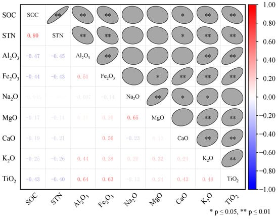 Correlation analysis of major metal oxides (Al2O3, Fe2O3, Na2O, MgO, CaO, K2O, and TiO2) contents in soil with SOC and STN contents. “*” and “**” indicate a significant correlation at the 0.05 level and 0.01 level, respectively.