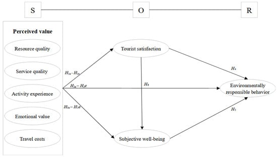 SOR theory originated from the stimulus–response theory put forward by Woodworth in 1929. Mehrabian and Russell introduced individuals’ internal cognitive and affective activities as the “organism” factor, formally constructing the SOR theory []. The theory posits that individuals respond to environmental stimuli with behaviors such as convergence (e.g., exploring, staying, interacting) or avoidance (e.g., reacting negatively) []. Since its introduction, SOR theory has been applied in various fields, including economics, education, marketing, tourism management, and information management systems [,]. In tourism research, SOR theory is frequently applied to forecast and analyze tourists’ behaviors. Bigne et al. (2020) utilized SOR theory to explain consumers’ decision-making processes when confronted with conflicting online reviews, reporting that external stimuli (online reviews) influence individuals’ internal cognitive and affective appraisals, which subsequently affect their behavioral intentions, using eye-tracking and conscious information processing models []. Kim et al. (2020) expanded the utilization of this theory, demonstrating the critical role of cognitive response in eliciting tourists’ emotional responses, VR attachment, and visit intentions by using real experience as the stimulus, cognitive and emotional response as the organism, and VR attachment and visit intentionality as the response outcome []. Liu (2021) applied SOR theory to analyze the factors influencing consumer behavioral intentions in sports tourism, using motivation, opportunity, and ability as stimulus factors, and consumer perceived usefulness, user-friendliness, and risk as organismic factors []. Some scholars believe that the application of SOR theory in tourism research exists in the abuse of theory, simple application and dogmatic use, and lack of close integration with the tourism context, the depth of the integration of SOR theory in the field of tourism is also a direction for in-depth discussion in this paper []. Based on this analysis, the current study uses tourists’ perceived value as an external stimulus, satisfaction and subjective well-being as organismic experiences, and environmentally responsible behavior as the final response to examine the mechanism influencing visitors’ perceived value of forest parks and their environmentally responsible behavior.