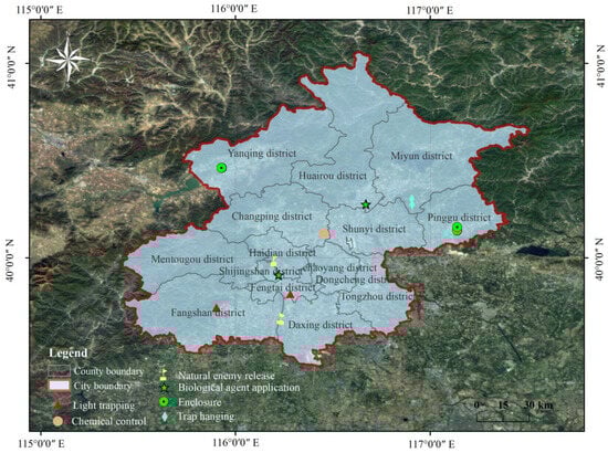 Beijing, the capital of the People’s Republic of China, is situated in the northern part of the North China Plain (115°20′~117°30′ E, 39°.28′~41°05′ N), covering a total area of 16,410 km2 (Figure 1). The terrain features a “high in the northwest and low in the southeast” gradient, the southeast is predominantly plain (38.6%), while the northwest is mountainous (61.4%), with an average elevation of 43.5 m. The climate is classified as a warm temperate semi-humid continental monsoon, characterized by cold, rainy summers and cold, dry winters. The annual average temperature ranges from 9.7 °C to 12.8 °C, and annual precipitation varies between 424 mm and 661 mm, with most rainfall occurring in July and August. The soil mainly includes brown soil, tidal soil and brown soil. Vegetation is predominantly composed of warm temperate deciduous broadleaf forests, supplemented by temperate coniferous forests []. Common landscape greening plants include Sophora japonica Linn., Pinus tabuliformis Carr., Fraxinus chinensis Roxb., Ulmus pumila L., Populus tomentosa, Populus simonii Carr., Salix babylonica, Firmiana platanifolia (L. f.) Marsili, Jasminum nudiflorum Lindl., Rosa chinensis Jacq., Ligustrum quihoui Carr., Ophiopogon japonicus, Iris tectorum. The main harmful organisms in landscaping comprise various pests, including piercing–sucking pests, leaf feeders, underground pests, and borers, such as amauronematus saliciphagus Wu, Cinara tujafilina del Guercio, Apocheima cinerarius Erschoff, Hyphantria cunea Drury, Dioryctria splendidella Herrich-Schaeffer, Semanotus bifasciatus Motschulsky, Dendroctonus valens LeConte.