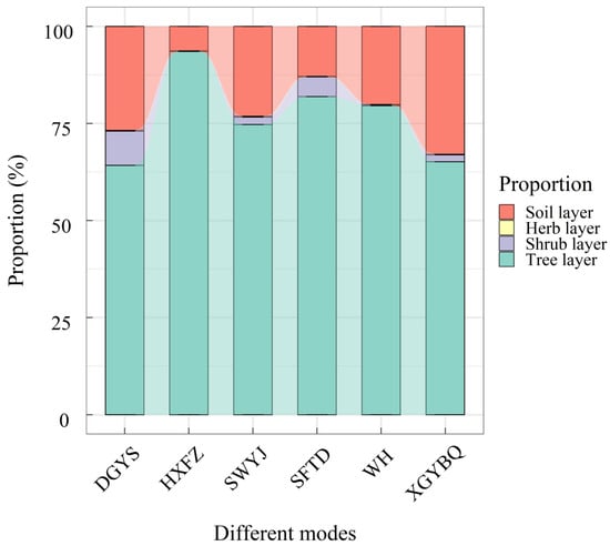 The carbon storage composition of each LGPCMs was somewhat similar (Figure 3). The tree layer carbon storage accounted for the largest proportion (64.19%~93.52%), followed by the soil layer (6.32%~32.97%), shrub layer (0.07%~8.85%), and herb layer (0.08%~0.18%). HXFZ had the highest proportion of the tree layer carbon storage (93.52%), followed by SFTD (81.92%), WH (79.57%) and SWYJ (74.7%). The proportion of the tree layer carbon storage in DGYS was the smallest, at 1.43% lower than that of XGYBQ. XGYBQ had the highest proportion of the soil layer carbon storage, followed by DGYS, SWYJ, WH, SFTD and HXFZ. The proportion of the shrub layer carbon storage was the largest in DGYS, followed by SFTD (5.08%) and HXFZ (0.07%). DGYS, SWYJ, WH, SFTD, and XGYBQ had 126.43, 27.71, 0.01, 3.2, and 25.14 times more carbon storage in the shrub layer than HXFZ, respectively. The carbon storage in the herb layer was significantly lower than that in the tree, shrub and soil layers, with SWYJ having the largest proportion of carbon storage in the herb layer, followed by DGYS (0.15%), XGYBQ (0.15%), and SFTD (0.11%). The herb layer carbon storage in WH was the lowest, which was 11.11% less than that in HXFZ. The carbon storage of DGYS was composed of 64.19% of tree layer, 8.85% of shrub layer, 0.15% of herb layer and 26.81% of soil layer. In HXFZ, the proportion of carbon storage in the tree layer was 1136 times that of the shrub layer, 1039.11 times that of the herb layer, and 14.8 times that of the soil layer. SWYJ exhibited 74.7% of carbon storage in the tree layer, 23.18% in the soil layer, and minimal carbon storage in the shrub and herb layers (2.12%). The carbon storage in SFTD comprised 81.92% from the tree layer, 5.08% from the shrub layer, 0.11% from the herb layer, and 12.89% from the soil layer. In WH, the proportion of carbon storage in the tree layer was 3.95 times greater than that in the soil layer, with the shrub layer contributing only 0.23% and the herb layer 0.08%. The composition of XGYBQ carbon storage was ranked as follows: tree layer (65.12%) > soil layer > shrub layer > herb layer (Figure 3).