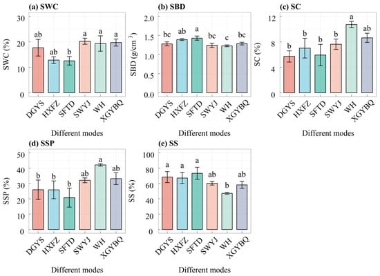 Different LGPCMs significantly affected on SBD, SC, SSP, and SS (p < 0.05), while having an insignificant effect on SWC (p > 0.05) (Figure 4). SWC was the highest in SWYJ (20.2%), followed by XGYBQ (19.69%) and WH (19.3%), with no significant difference observed among these treatments and DGYS or HXFZ (Figure 4a). SFTD had the lowest SWC and HXFZ had a 2.24% higher SWC than SFTD, but the difference was not significant (Figure 4a). Significant differences in SBD were observed among the LGPCMs (Figure 4b), with SFTD having the highest (1.43 g/cm3). HXFZ had the second highest SBD (1.39 g/cm3), which was significantly greater than WH by 13.01%. WH had the lowest SBD, significantly lower than SFTD and HXFZ by 13.99% and 11.51%, respectively (Figure 4b). The SC of different LGPCMs was significantly different, ranging from 5.7% to 10.71% (Figure 4c). WH recorded the highest SC (10.71%), which was 24.25% greater than that of XGYBQ (p > 0.05). Compared to WH, SC was significantly reduced in DGYS, HXFZ, SFTD, and SWYJ by 46.78%, 34.73%, 44.72%, and 28.94%, respectively. Additionally, the SC of HXFZ was 8.15%, 34.73% and 18.91% lower than that of SWYJ, WH and XGYBQ, respectively (p > 0.05). DGYS had the lowest SC (5.7%), significantly lower than WH (Figure 4c). Significant differences in SSP were also observed among LGPCMs, ranging from 20.75% to 42.14% (Figure 4d). Compared to WH (maximum, 42.14%), SSP was reduced in SWYJ and XGYBQ by 23.85% and 21.26% (p > 0.05), while reductions in DGYS, HXFZ, and SFTD were statistically significant at 38.47%, 38.68%, and 50.76% (p < 0.05), respectively. SFTD had the lowest SSP (20.75%), significantly lower than that of DGYS and HXFZ by 19.98% and 19.70%, respectively. The SSP of WH was 1.63 times greater than that of HXFZ (Figure 4d). Lastly, different LGPCMs significantly affected SS, with values ranging from 47.15% to 73.33% (Figure 4e). SFTD had the largest SS (73.33%), which was 7.24%, 9.19%, 21.61%, 55.52%, and 25.95% higher than DGYS, HXFZ, SWYJ, WH, and XGYBQ, respectively. WH had the smallest SS, significantly lower than SFTD, DGYS, and HXFZ. The SS of HXFZ (67.16%) was significantly higher than that of WH by 42.44%, yet 1.78% and 8.41% lower than DGYS and SFTD, respectively (Figure 4e).
