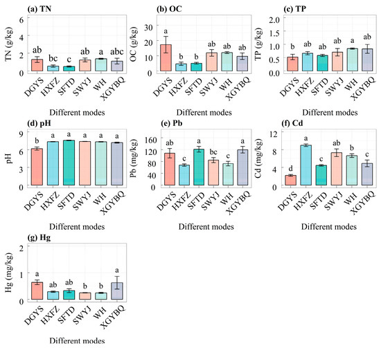 Effects of different LGPCMs on soil chemical properties. TN—total nitrogen; OC—organic carbon; TP—total phosphorus; pH—soil pH; Pb—lead; Cd—cadmium; Hg—mercury. Different lowercase letters indicate significant differences among LGPCMs (p < 0.05). The same applies below.