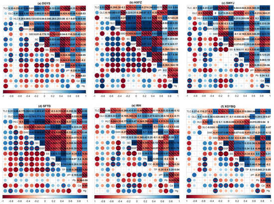 The relationship between carbon storage in the tree layer, shrub layer, herb layer and soil layer and soil physicochemical properties varied under different LGPCMs (Figure 6). Under DGYS, the tree layer carbon storage was positively correlated with SWC and SC (p < 0.05), but negatively correlated with pH (−0.94) and Hg (0.92) (p < 0.01) (Figure 6a). Additionally, carbon storage in both the shrub and soil layers showed significant positive correlations with TN (>0.89) and OC (>0.92). The soil layer carbon storage was also positively correlated with SWC (0.93) (Figure 6a). Under DGYS, SWC was significantly positively correlated with SC, SSP, and OC, while significantly negatively correlated with SS, TP, and pH. TP was significantly positively correlated with SS and pH, OC significantly positively correlated with TN and SWC, and SC was significantly negatively correlated with SSP. Conversely, SS was very significantly negatively correlated with both SC and SSP (Figure 6a). Under HXFZ, the correlations between carbon storage in the tree and herb layers and soil physicochemical properties were not significant (Figure 6b). However, the shrub layer carbon storage was significantly positively correlated with Cd, while the soil layer carbon storage had significant positive correlations with TN and OC (Figure 6b). Under HXFZ, SS significantly negatively correlated with SC and SSP, whereas SSP significantly negatively correlated with TP, and SS significantly positively correlated with TP, TN and OC (Figure 6b). Under SWYJ, both the tree and herb layer carbon storage significantly negatively correlated with SC and SSP while positively correlating with SS (Figure 6c). Additionally, the tree layer carbon storage had significant positive correlations with SBD, Cd, and Hg. Under SWYJ, the shrub layer carbon storage was only negatively correlated with SWC (−0.9). The soil layer carbon storage had significant positive correlations with SWC, TN (0.97) and OC (0.96), along with a very significant negative correlation with pH (−0.96). Under SWYJ, pH was significantly negatively correlated with SWC, TN, OC, Cd with SC, SSP, Hg with SC, SS with SC and SSP, while SBD was significantly positively correlated with SS, Cd, SC with SSP, Cd with SS, Hg, TP with TN, OC, TN with OC (Figure 6c). Under SFTD, carbon storage in both the tree and herb layers significantly negatively correlated with Cd (Figure 6d). Moreover, the shrub layer carbon storage displayed a negative correlation with OC and pH but a positive correlation with Hg (0.89). The herb layer carbon storage significantly negative correlations with SWC, SC, and SSP, while positively correlating with SS and TP (Figure 6d). The soil layer carbon storage had a strong negative correlation with SBD (−0.87) and very strong positive correlations with TN (0.92) and OC (0.97) (Figure 6d). Under WH, the tree layer carbon storage showed a significant negative correlation with TN (−0.92), whereas the soil layer carbon storage had significant positive correlations with TN (0.93) and OC (0.94) (Figure 6e). Carbon storage in both the herb and shrub layers did not significantly correlate with soil physicochemical properties (Figure 6e). Under WH, Hg significantly negatively correlated with Pb, while Cd correlated negatively with pH, SS, and SWC. pH also negatively correlated with SC and SSP, while SWC significantly negatively correlated with SC and SSP. Conversely, SC had significant positive correlations with SSP, while TN correlated positively with OC, as did pH with SWC and SS (Figure 6e). Under XGYBQ, the tree layer carbon storage was only significantly positively correlated with Pb (0.86), while carbon storage in shrub and herb layers did not significantly correlate with soil physicochemical properties (Figure 6f). However, the soil layer carbon storage was significantly positively correlated with TN (0.95), OC (0.99), and TP (0.88) (Figure 6f). Under XGYBQ, TP and TN, OC, TN and OC, Hg and Pb, SBD, Cd and SC, SSP, Pb and SBD, SSP and SC were significantly positive correlated, SS and Cd, SSP, SC were significantly negative correlated (Figure 6f).