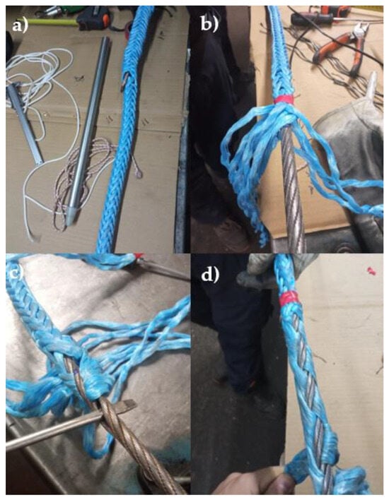 - Braiding of the synthetic and the wire cables was carried out. The first thirty centimeters of synthetic rope was unbraided up to the base of the conic steel core. This area was fixed with a loop of tape to avoid the accidental unbraiding of the synthetic rope (Figure 3b). The loose synthetic strands were joined in three bunches, each with the same number of strands, and braided, intercalated, under two consecutives steel strands (Figure 3c) until each bunch of synthetic strands was completely used (Figure 3d). This was the most complex and time-consuming step of the hybrid splicing. At the end of the process, the hybrid splice featured the conical steel core on one side, the steel cable inside the synthetic rope in the center and the braided part on the other side.