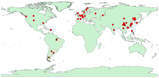 Geographical distribution of the experimental sites used in this study. Red dots represent sampling spots.