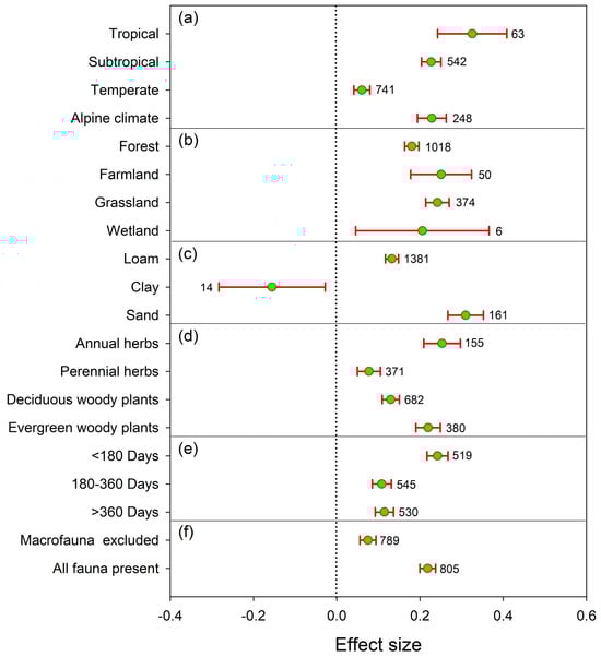 Mean effect size of soil fauna presence on litter mass loss at global scale. (a–f) represent the climate, ecosystem, soil, litter type, decomposition duration, and faunal community, respectively. The numbers adjacent to each circle represent the sample sizes. For sample sizes below 20, confidence intervals were calculated using bootstrapping. Error bars represent 95% confidence intervals. The significance of the faunal effect was determined by the absence of overlap between the 95% confidence intervals and zero.