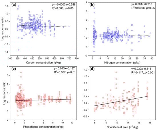 Effects of initial economics traits on soil fauna regulation of litter decomposition. (a, b, c, d) represent carbon, nitrogen, phosphorus concentration, and specific leaf area, respectively. Blue circles and dashed lines present that there is no statistically significant correlation between the economics traits and response ratio of soil fauna to mass loss, while red circles and solid lines indicate a significant correlation between the economics traits and the response ratio of soil fauna to mass loss.
