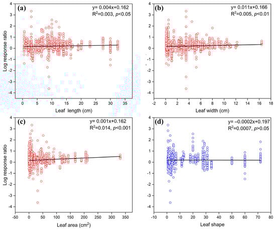 Effects of initial size and shape traits on soil fauna regulation of litter decomposition. (a, b, c, d) represent leaf length, width, area, and shape, respectively. Blue circles and dashed lines indicate that there is no significant correlation between size–shape traits and the response ratio of soil fauna to mass loss, while red circles and solid lines indicate a significant correlation between size and shape traits and the response ratio of soil fauna to mass loss.