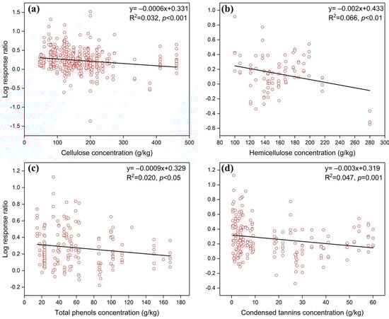 Effects of initial defense traits on soil fauna regulation of litter decomposition. (a, b, c, d) represent cellulose, hemicellulose, total phenols, and condensed tannins concentrations, respectively. Solid lines indicate a significant correlation between the defensive trait response ratio of soil fauna to mass loss.