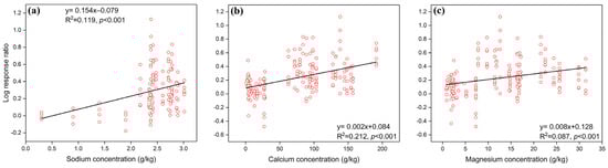 Effects of initial metal elements on soil fauna regulation of litter decomposition. (a, b, c) represent sodium, calcium, and magnesium concentrations, respectively. Solid lines indicate a significant correlation between metal elements and the response ratio of soil fauna to mass loss.