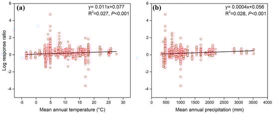 Effects of mean annual temperature (a) and precipitation (b) on soil fauna regulation of litter decomposition. Solid lines indicate that there is a significant correlation between the mean annual temperature or precipitation and the response ratio of soil fauna to mass loss.