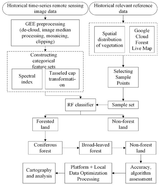 The GEE platform was used to select time series image data, complete image preprocessing, and construct a spectral classification feature set based on the characteristics of forest and vegetation cover in Finland. By combining the spatial distribution of vegetation data with the platform’s forest reality map, uniform sample points covering the whole country of Finland were selected to form a five-phase sample set, which was then trained and classified using the random forest algorithm. First, the classification of forested and non-forested land was completed; then, the forested land was pruned to complete the classification of coniferous and broadleaved forests. Finally, accuracy and algorithms were evaluated, and mapping and data analysis were completed. (Figure 2).