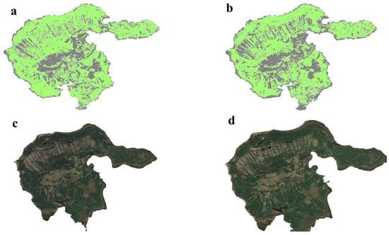 Meanwhile, in total, 1240 sample points of coniferous forests, broadleaf forests, and unforested land were randomly and uniformly selected using the three-scene data of GF-2 and GF-7 imagery to validate the accuracy. The validation was completed by randomly selecting various types of validation points in the three high-resolution images to compare with the regions and some pixel points in the classification results. The overall classification accuracy was 88.9%, with a Kappa coefficient of 82.67%. Among the sample points, the F1-scores of the above three land types were 0.91, 0.86, and 0.87. The results are shown in Table 1. Considering the consistency of national imagery over the years, the validation results are also considered valid for the period 1980–2000. An example of the classification is presented in Figure 3. It can be noticed that broadleaf forests have the highest number of misclassifications, which may be due to the fact that broadleaf forests tend to grow in urban areas, on the borders of cultivated land, and intermixed with coniferous forests.
