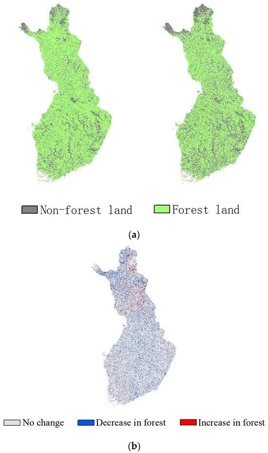 Forest and non-forested land classification (a) in 1980 and 2020; (b) the spatial change in forested land and non-forested land from 1980 to 2020.