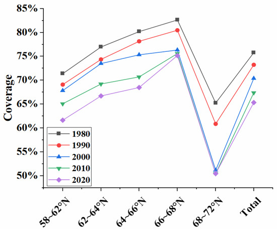Since the samples of coniferous and broadleaf forests were re-selected for classification and the number of image element statistics was changed, there was a small error in the statistics of coverage and other information, but the results were proved to be still valid by the accuracy assessment and trend comparison. The coverage of coniferous forests and broadleaf forests in each latitude in the last forty years is shown in Figure 8.