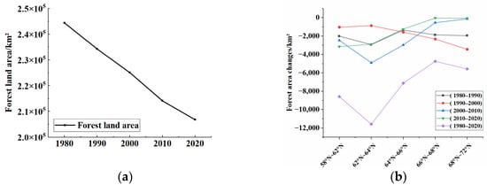 Changes in the area of forested land: (a) overall trends; (b) spatial and temporal changes in forests in the various latitudinal zones.